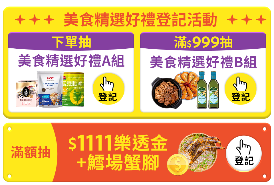 - 參與活動商品:參與活動商品為商品頁面有【美食11月★下單抽精選好禮A組】登記活動標示之商品始適用。