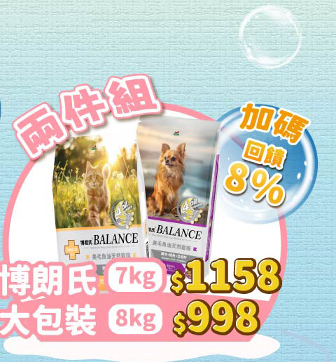 - 購買『博朗氏貓飼料7KG x 2件組(商品編號:3195730)、博朗氏狗飼料8KG x 2件組(商品編號:7577172)』,加碼回饋該品項結帳含稅發票金額之8%樂透金。