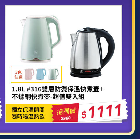 CookPower 鍋寶 1.8L #316雙層防燙保溫快煮壺+不鏽鋼快煮壺-超值雙入組(三色任選)