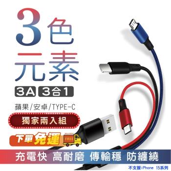 【買一送一】三色元素 3.0A 三合一編織充電線 Micro USB TYPE-C Lightning