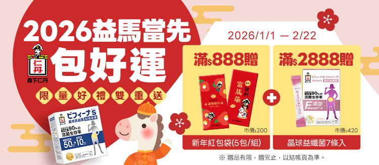 - 下單登記抽保健好禮(隨機送共18名),【森下仁丹晶球長益菌(7包/盒)X2盒】-6名或【船井97%Omega-3日本進口rTG高濃度純淨魚油(10顆/盒)】-12名。獎項將於2026/03/05後陸續寄出。