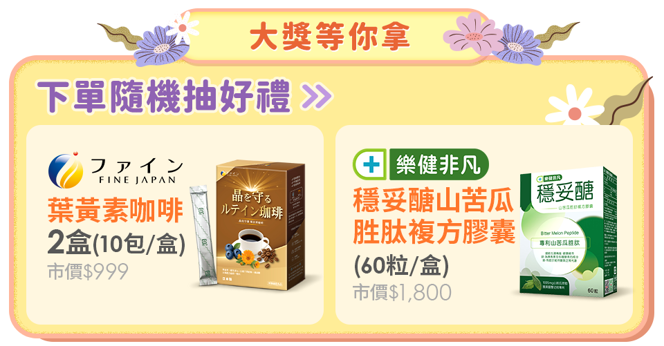 下單登記抽保健好禮(隨機送共18名),【FINE葉黃素咖啡2盒(10包/盒)】-6名或【樂健非凡穩妥醣山苦瓜胜肽複方膠囊(60粒/盒)】-12名。 獎項將於2026/06/10後陸續寄出。