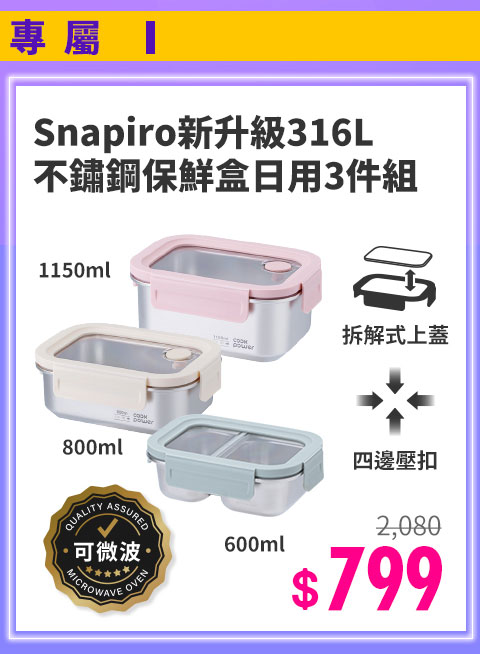 【CookPower 鍋寶】Snapiro可微波316L不鏽鋼分隔保鮮盒 雙雙對對4件組