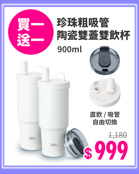 買一送一【CookPower鍋寶】珍珠粗吸管陶瓷隨行杯900ml(3色選)