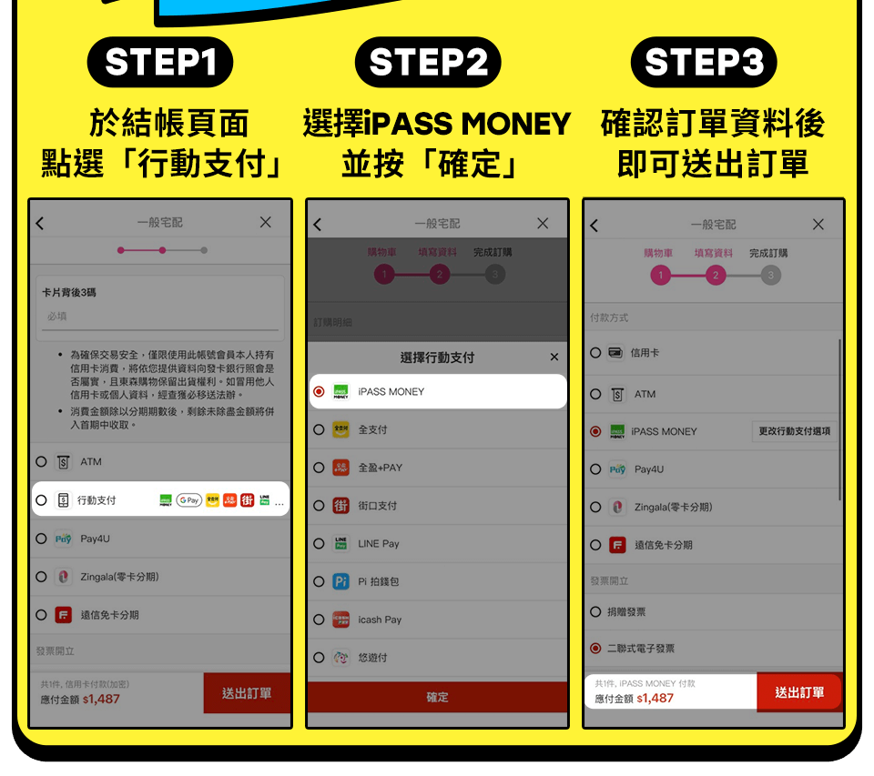 - 限透過iPASS MONEY APP完成付款且符合各優惠指定條件,如有取消交易或退貨之交易金額將不納入計算。如付款路徑為「LINE Pay」>「iPASS MONEY」,恕不符合回饋資格。