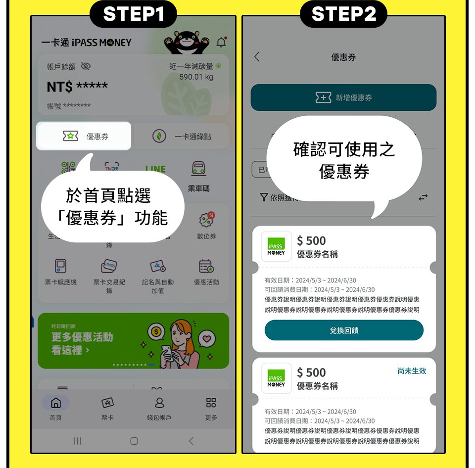 - 用戶欲使用iPASS MONEY優惠券須下載iPASS MONEY APP並登入iPASS MONEY 帳戶,方可於符合資格消費後使用優惠券兌換回饋。