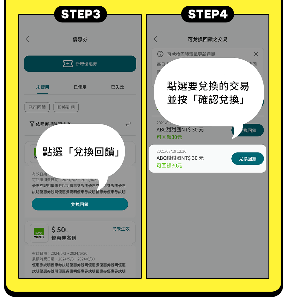 - 優惠劵使用方式係從可兌換回饋交易清單中選取一筆交易以兌換優惠劵面額之回饋。回饋金額視為儲值款項,並紀錄於您的 iPASS MONEY 帳戶,本公司將以 APP 畫面通知您完成兌換回饋之金額。每筆交易限以優惠券兌換一次,折抵後便無法使用任何優惠券或點數再次兌換回饋或折抵。